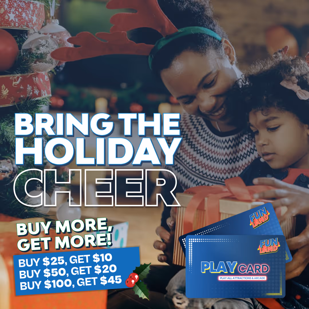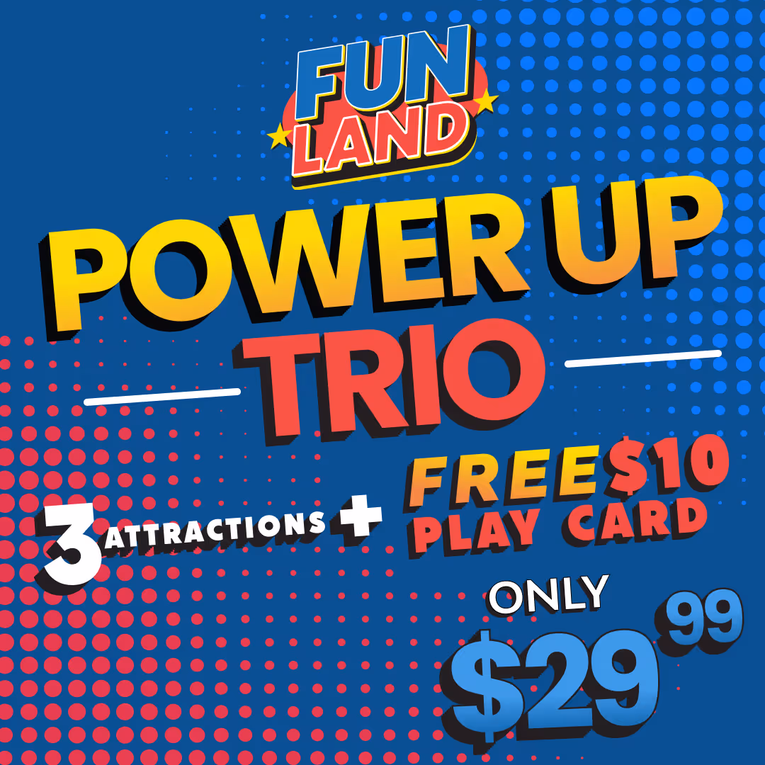 Level up your fun at Fun Land! Pick your favorite three attractions and get a $10 play card! Receive an EXTRA $5 play card FREE when you purchase online.